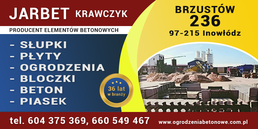 Producent elementów betonowych „JARBET” Krawczyk to największy i najbardziej znany producent elementów betonowych w regionie. Firma powstała z inicjatywy Jarosława Krawczyka w 1991 roku. Przez cały czas firma unowocześniała produkcje elementów betonowych poprzez zmiany technologii produkcji dostosowując ją do światowych trendów i norm produkcyjnych. Posiadamy atesty na beton oraz produkowane przez nas wyroby. Beton używany w produkcji wytwarzany jest na naszym węźle betoniarskim. Dzięki temu nasze wyroby są wysokiej jakości, co nie przekłada się na wygórowaną cenę. Produkty wytwarzane w naszej firmie docierają do klientów w całym kraju, jak również poza jego granicami. Jest to możliwe dzięki geograficznemu położeniu i bardzo dobrze rozbudowanej sieci sprzedaży. Firma cieszy się bardzo wysoką renomą w produkcji elementów betonowych i betonu oraz sprzedaży piasku. Nasze produkty są w przystępnej cenie, trwałe oraz łatwe do zamontowania. Istnieje możliwość malowania zewnętrznymi farbami emulsyjnymi lub koloryzującymi impregnatami do betonu.   Nasza firma produkuje przede wszystkim: - słupki sadownicze do rusztowań w sadzie, - słupki do tuneli foliowych, - słupki do siatki leśnej, - słupki do malin, - słupki do mini kiwi, - słupki pod borówkę, - słupki do ogrodzeń betonowych, - ogrodzenia betonowe, - płyty podwalinowe pod ogrodzenie panelowe, - łączniki do płyt podwalinowych: proste i narożne, - bloczki betonowe, - beton podsypkowy, suchy wszystkich klas wytrzymałości, - beton towarowy o konsystencji wilgotnej, C 8/10, C 12/15, C 16/20, C 20/25 , C 25/30 , C 30/37 - grunt stabilizowany cementem 1,5 MPa, 2,5 MPa, 5 MPa, - mieszanki związane cementem c 3/4 wg PN-EN 14227-1. Każdy produkowany element jest odpowiednio wzmacniany drutem żebrowanym o różnym przekroju, w zależności od rozmiaru i przeznaczenia.   Oferujemy również w sprzedaży piasek siany, o różnym uziarnieniu. Wystawiamy deklaracje zgodności na każdy wyrób, atest , etykieta, certyfikat